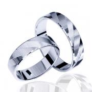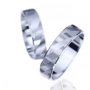 Par poročnih prstanov iz belega zlata. Prstana imata raven profil in diagonalno šrafirane linije gravure.