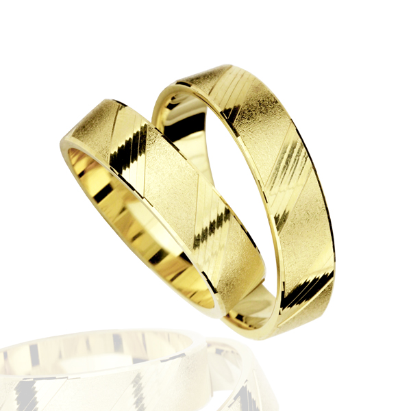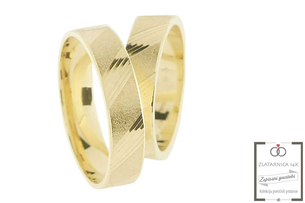 Par poročnih prstanov iz rumenega zlata. Prstana imata ravni profil. Na površini prstanov se izmenjujeta gladka in matirana površina.