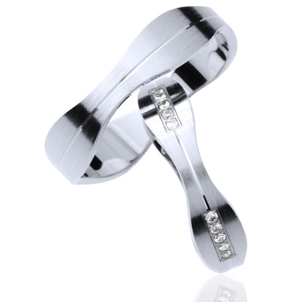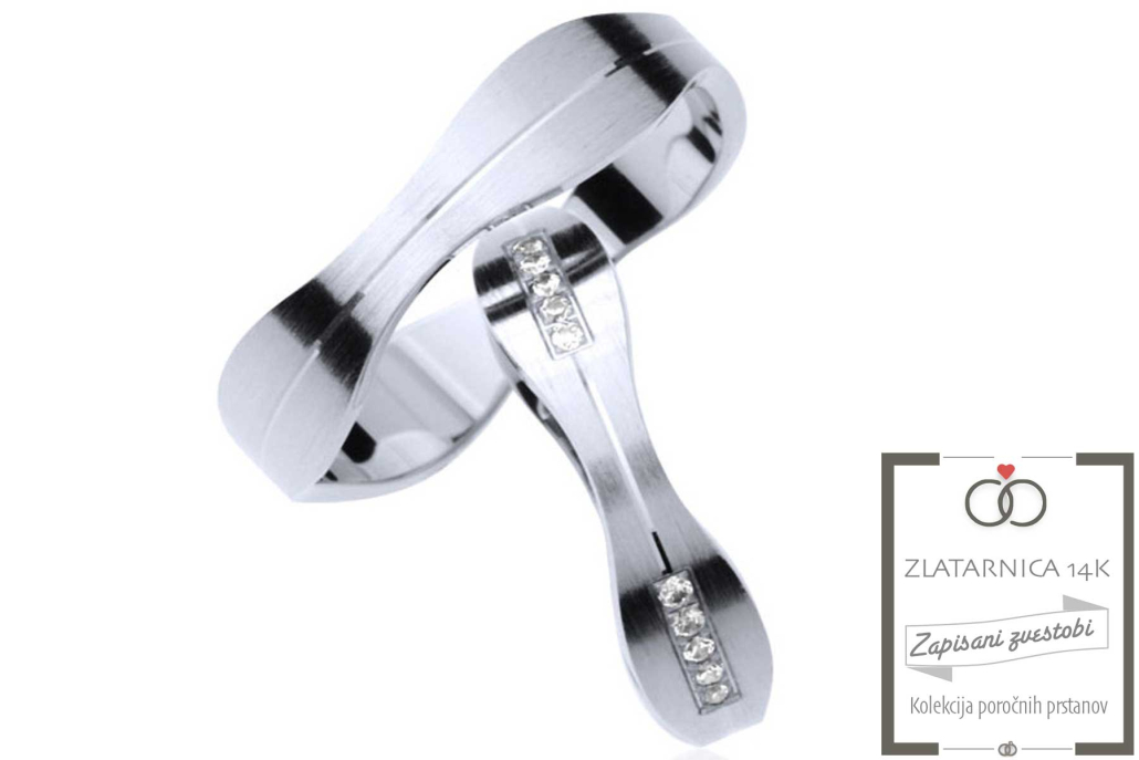 Par poročnih prstanov iz belega zlata. Prstana sta rahlo zarotirana. Površina je gladka, po sredini poteka črta. V ženski prstan so dodani cirkoni.