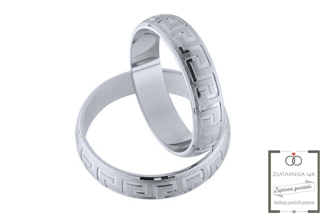 Par poročnih prstanov iz belega zlata. Površina prstanov je matinirana in obogatena z gladkimi črtami v grškem vzorcu.