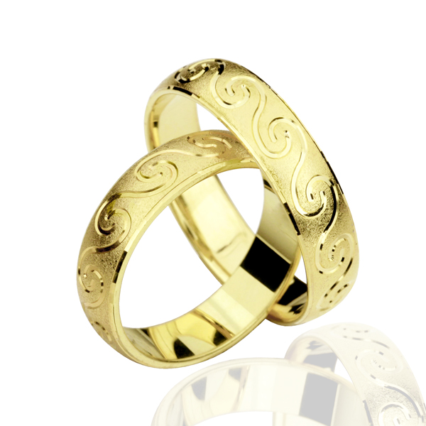 Par poročnih prstanov iz rumenega zlata. Robovi prstanov so gladki. Notranjost je matinirana, na njej so vgravirani vzorci v obliki valov.