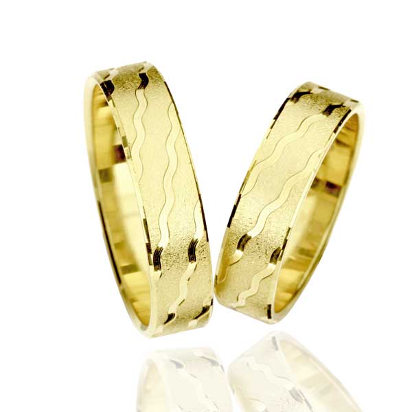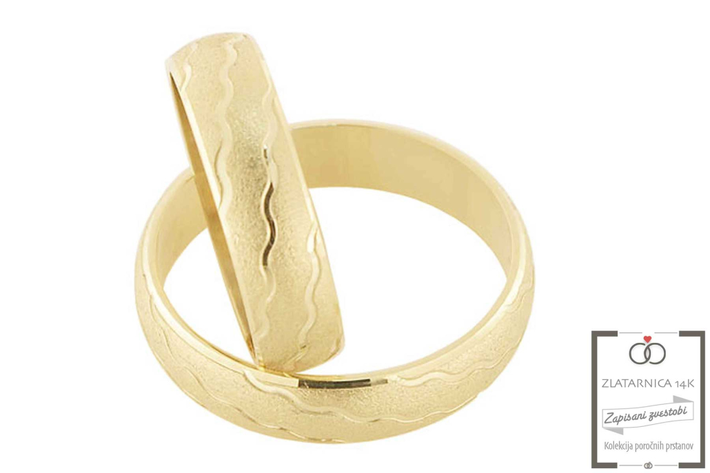 Par poročnih prstanov iz rumenega zlata. Na površini prstanov se izmenjujeta gladka in matirana površina.