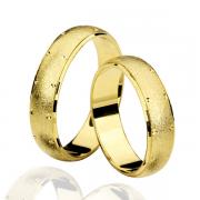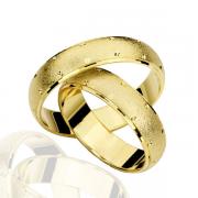 Par poročnih prstanov iz rumenega zlata polkrožnega profila. Ozek rob prstanov je poliran, srednji del pa matiran in okrašen s pikicami.