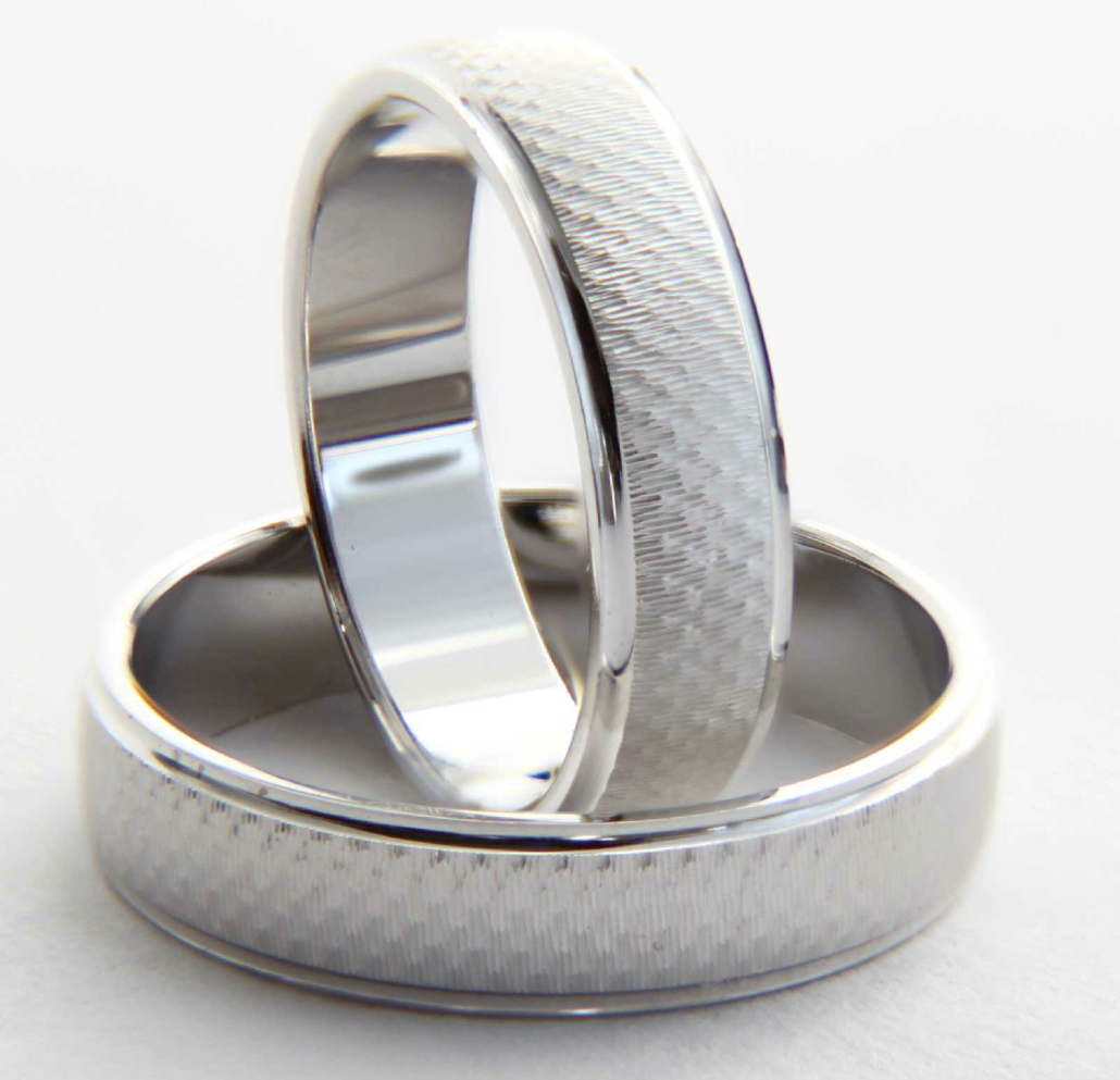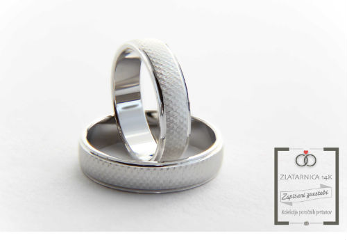 Par poročnih prstanov iz belega zlata. Prstana imata ovalni profil, robovi prstanov so gladki, sredina pa oblikovana v karirasti vzorec.