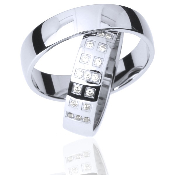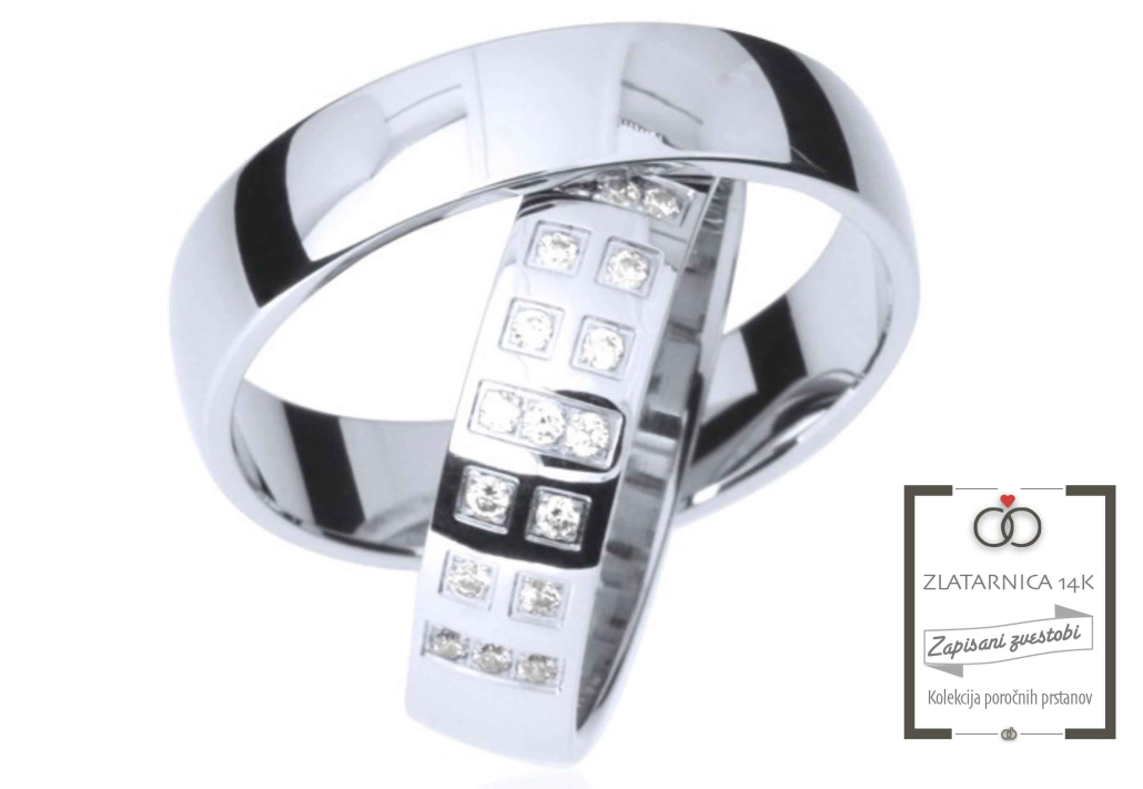 Par poročnih prstanov iz belega zlata. Prstana imata ovalni profil. Ženski prstan je obogaten s cirkoni, ki tvorijo zanimiv vzorec.