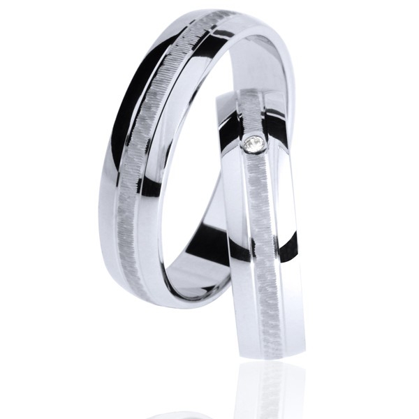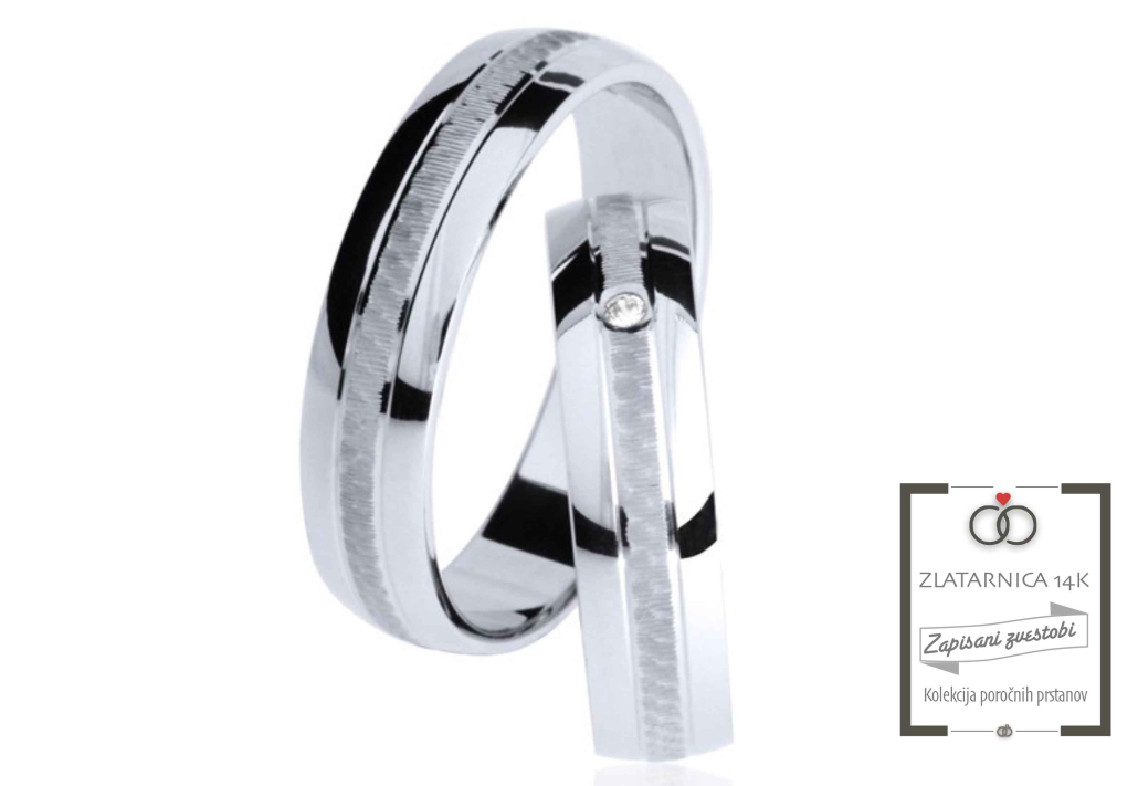 Par poročnih prstanov iz belega zlata. Prstana imata ovalni profil, po robovih potekata gladki črti, sredina prstana je črtkana. V ženski prstan je vkovan kamen.