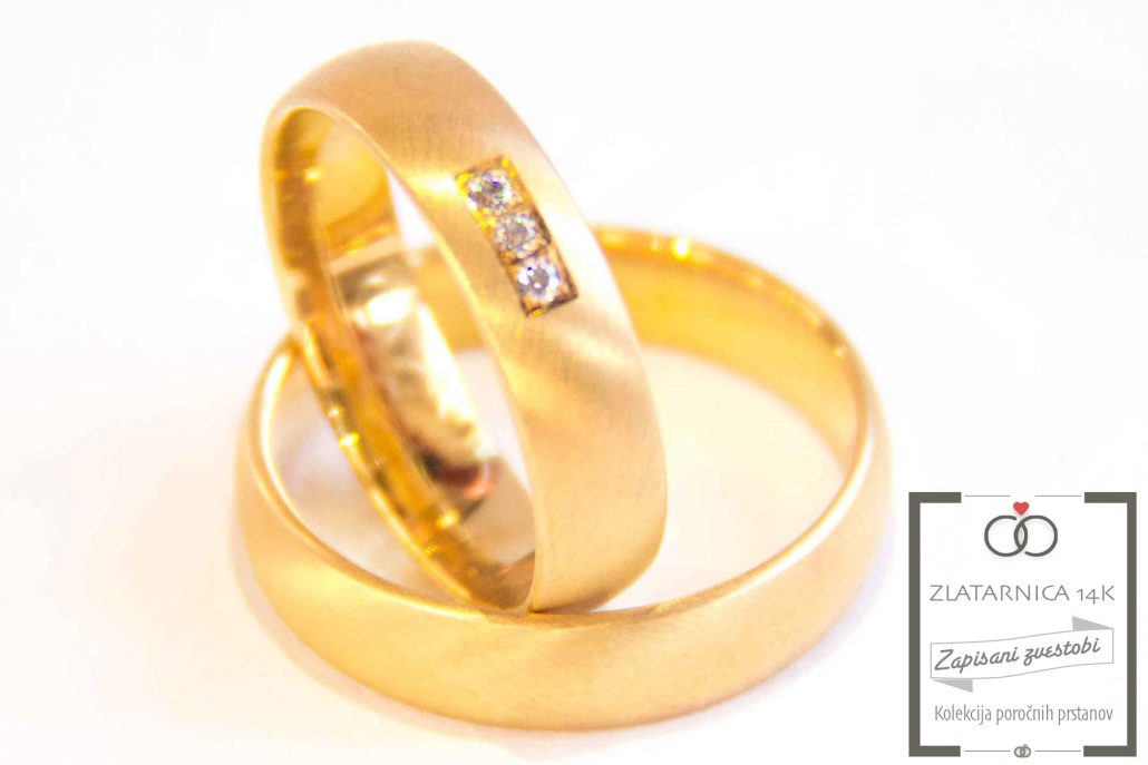 Par poročnih prstanov polkrožnega profila, satinirane površine iz rumenega zlata. V ženski prstan so vkovani cirkoni.