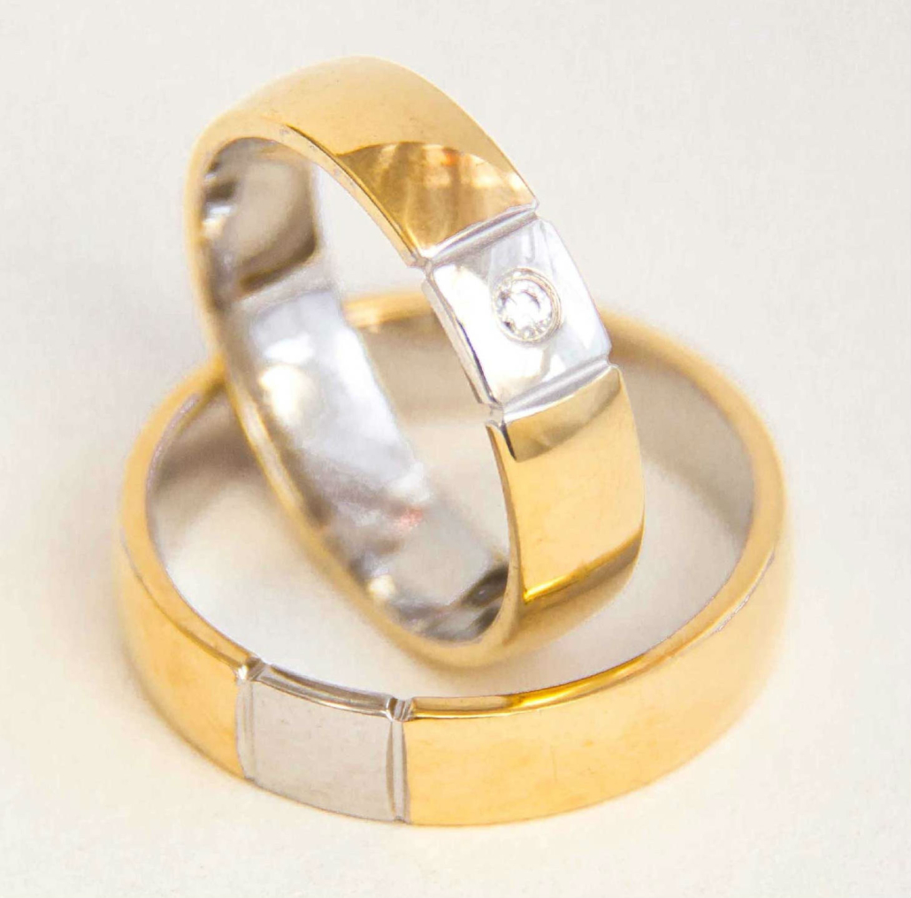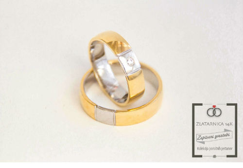 Par poročnih prstanov iz belega in rumenega zlata. V ženski prstan je vkovan kamenček (cirkon ali briljant).