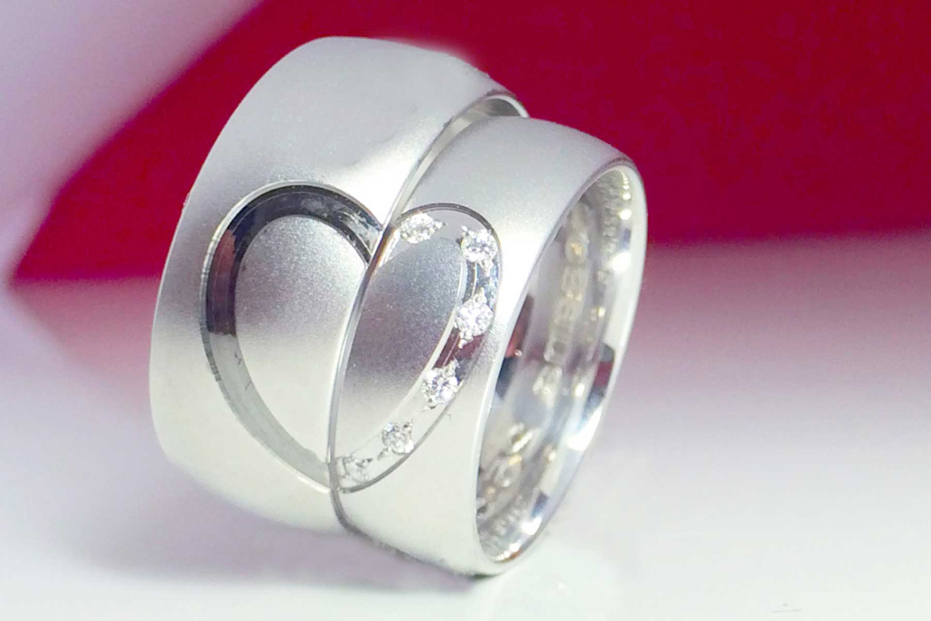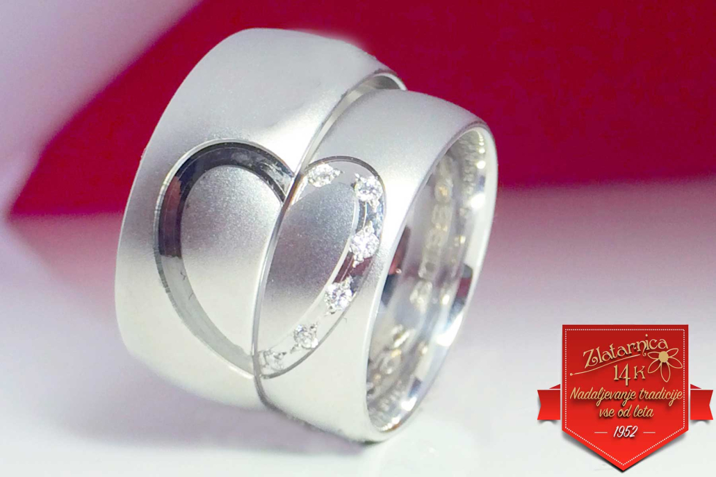 Par poročnih prstanov iz belega zlata s polkrožnim profilom. Vsak prstan ima gladko linijo, oblikovano v polovico srčka – oba prstana skupaj tvorita popolno srce. V ženskem prstanu so v linije srčka vkovani kamenčki (cirkoni ali briljanti). Površina prstanov je fino peskana.