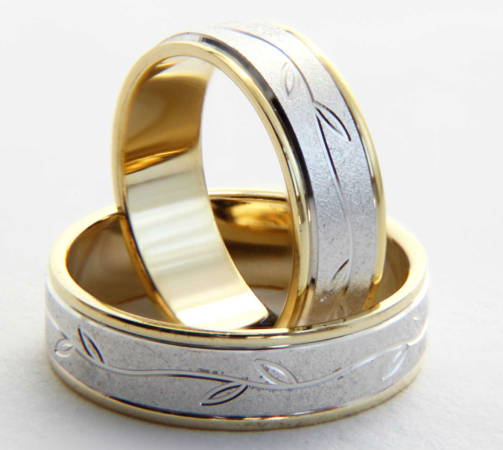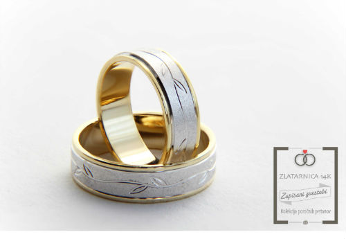 Par poročnih prstanov iz belega in rumenega zlata. Prstana imata ravni profil, površina je fino matirana. Na vsaki strani prstana potekata naokoli gladki črti, sredina prstana je privzdignjena, obarvana v drugi barvi zlata in vzorcem cvetja.