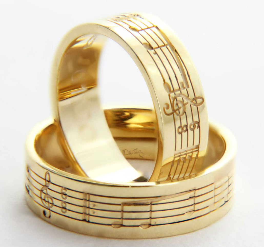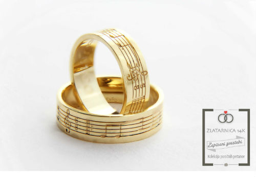 Par poročnih prstanov iz rumenega zlata. Prstana imata ravni profil, na površini je izrisano notno črtovje z notami.