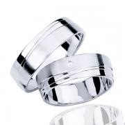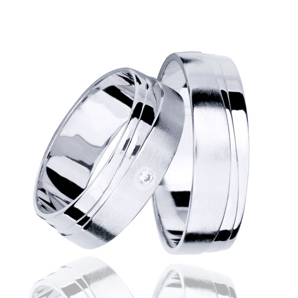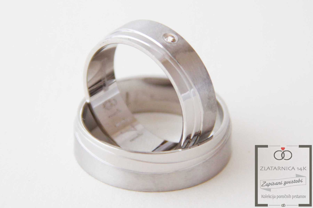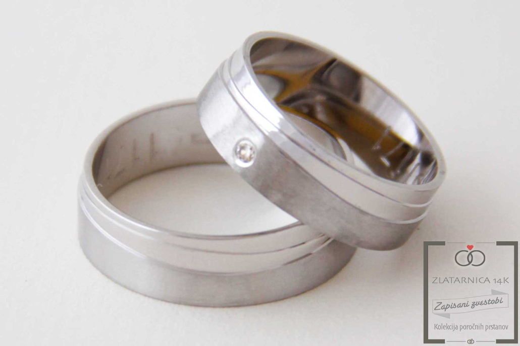 Par poročnih prstanov iz belega zlata, ravnega profila z delom ščetkane površine in s tremi stopničastimi poliranimi linijami. V ženskem prstanu je na ščetkanem delu vkovan cirkon.