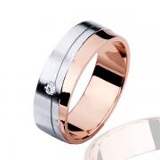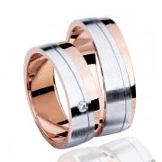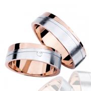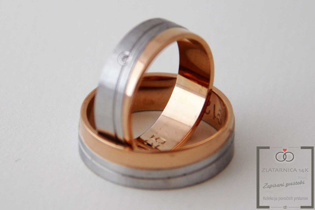 Par poročnih prstanov iz kombinacije belega in rdečega zlata. Prstana sta ravnega profila, z dvema prečnima linijama, ki ločujeta belo ščetkano površino od rdečega poliranega dela.V ženskem je vkovan cirkon.