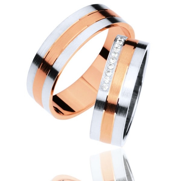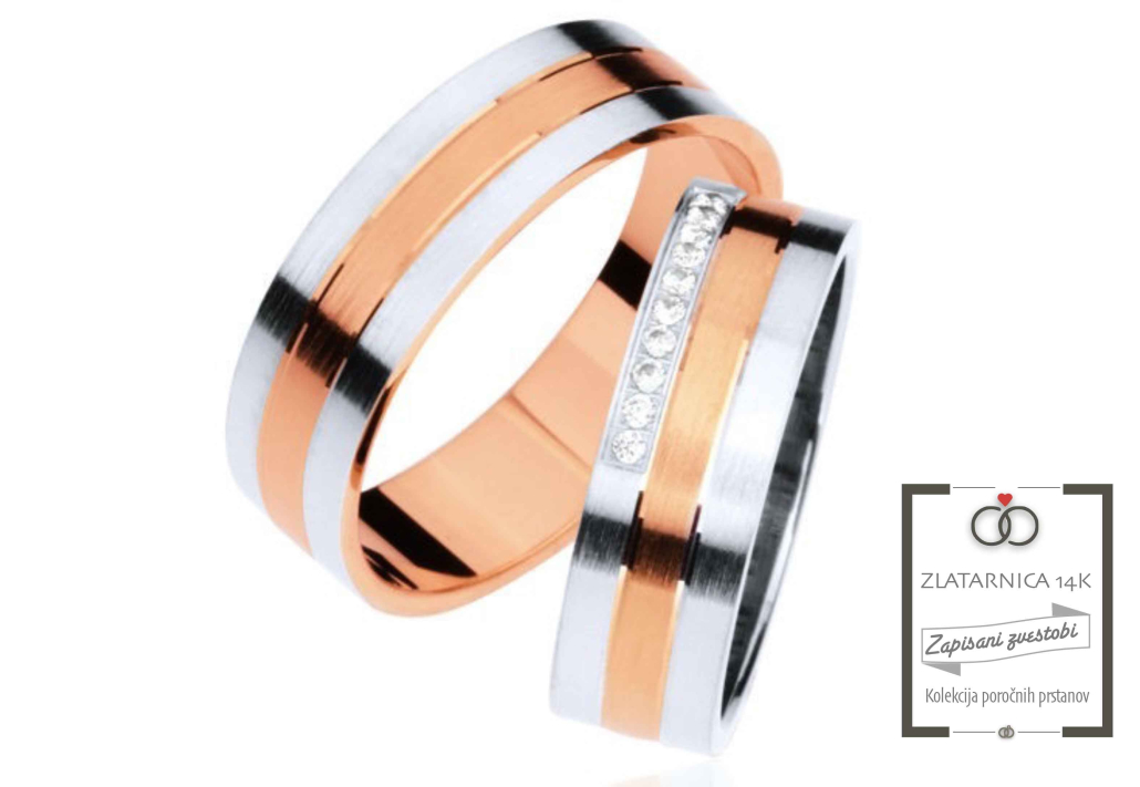 Par poročnih prstanov iz belega in rdečega zlata. Prstana imata ravni profil, po robovih potekata gladki črti iz belega, po sredini pa črta iz rdečega zlata. V ženski prstan so vkovani kamni.