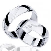 Par poročnih prstanov iz belega zlata. Prstana imata ovalni profil. Površina prstanov je gladka. Po prstanih potekajo tudi gladke črtice.