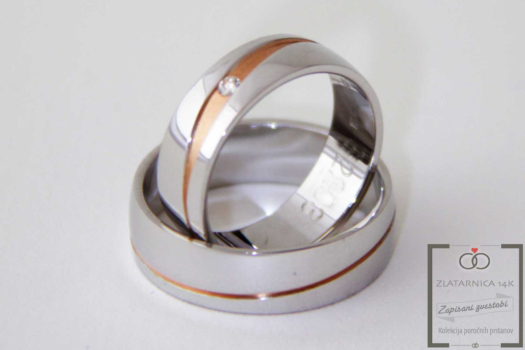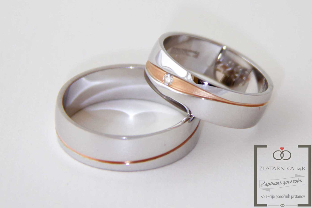 Par poročnih prstanov iz kombinacije belega in rdečega zlata. Prstana sta polkrožnega profila, moški z ozko linijo in ženski z insertom iz rdečega zlata in cirkonom.