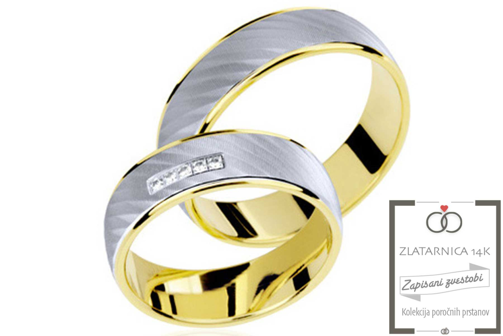 Par poročnih prstanov iz belega in rumenega zlata. Robovi prstanov so rumeni in imajo gladko površino, sredina je iz belega zlata. Ženskemu prstanu so dodani cirkoni.