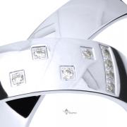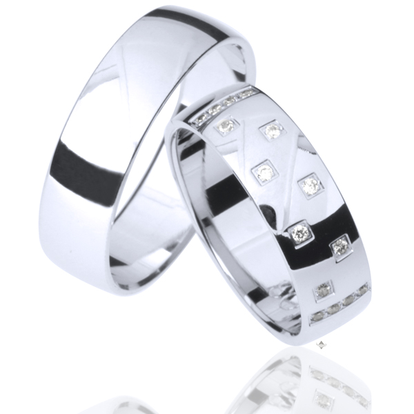 Par poročnih prstanov iz belega zlata. Prstana imata ovalni profil. Ženski prstan je obogaten s cirkoni, ki tvorijo zanimiv vzorec.