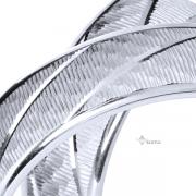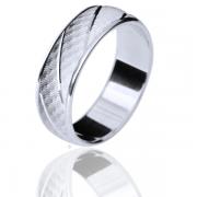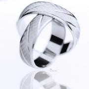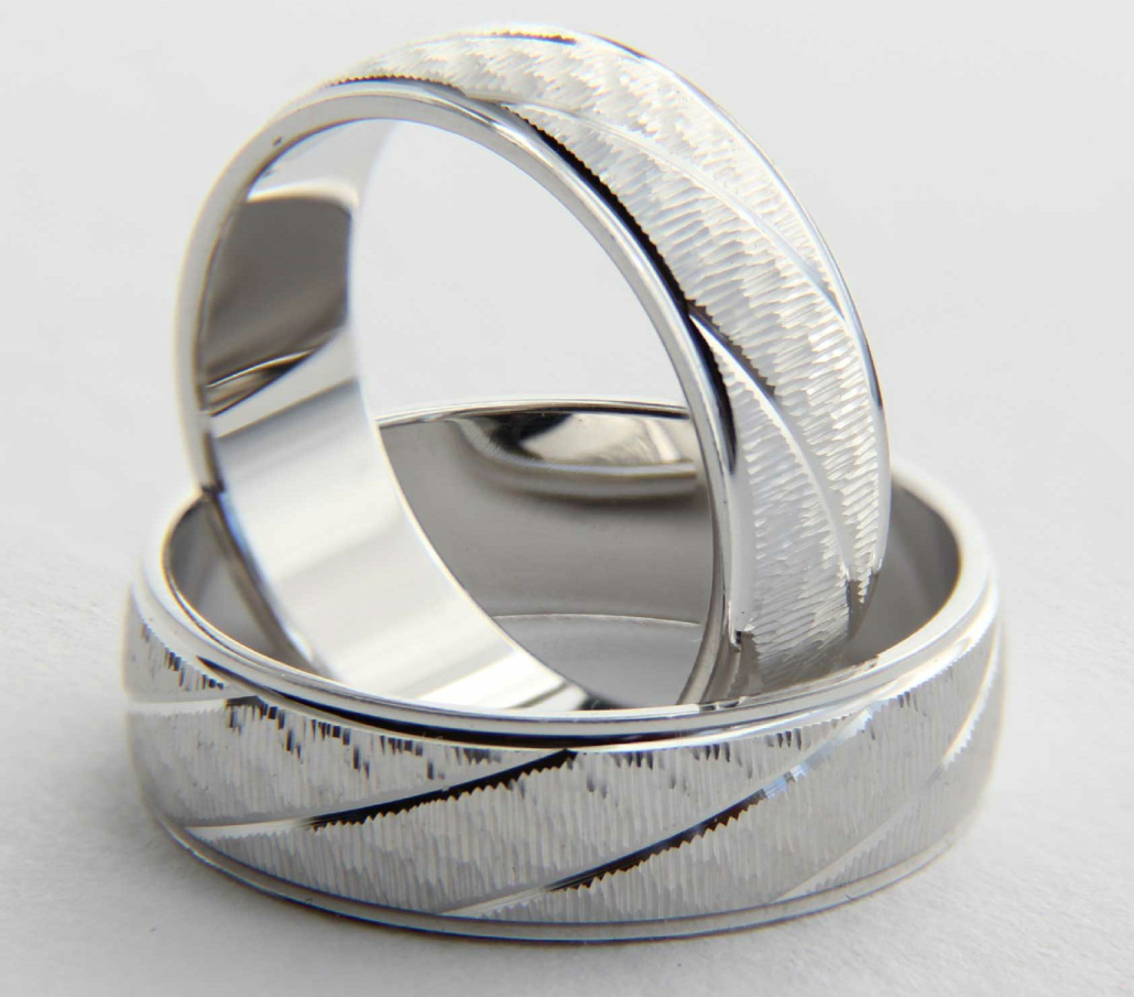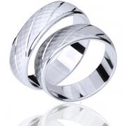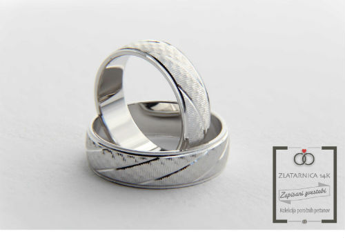 Par poročnih prstanov iz belega zlata. Prstana imata ovalni profil, po robovih potekata gladki črti. Površina prstanov je oblikovana v karirasti vzorec in obogatena z gladkimi diagonalnimi črtami.