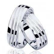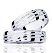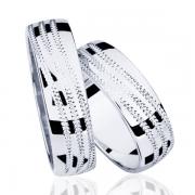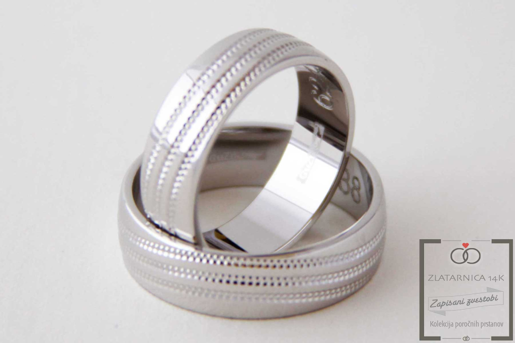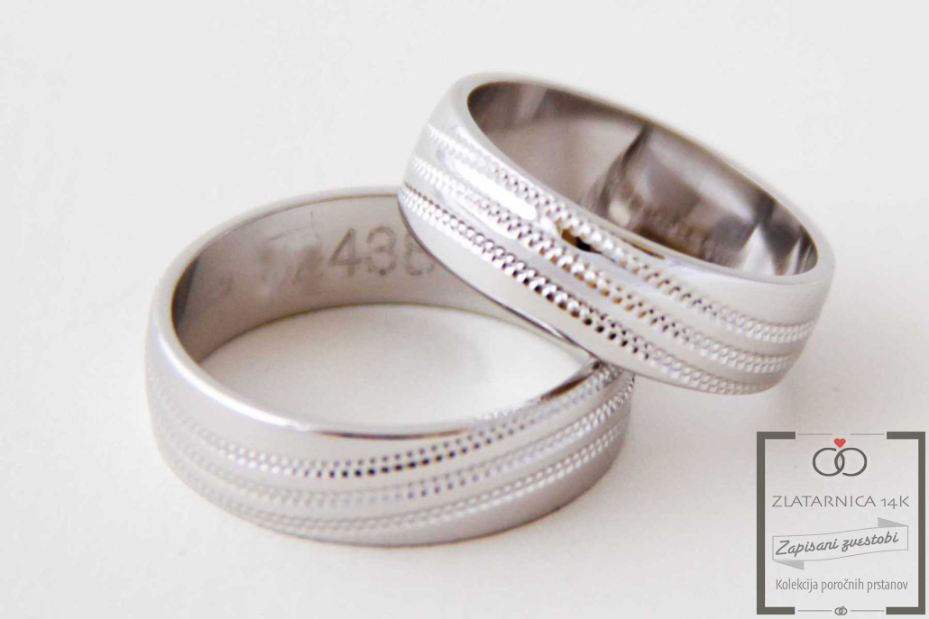Par poročnih prstanov iz belega zlata, polkrožnega profila z gravuro treh vzporednih vzorčastij liniji, ki potekajo diagonalno po obroču.