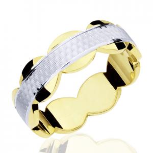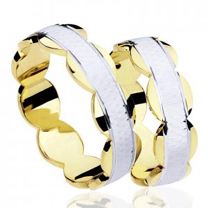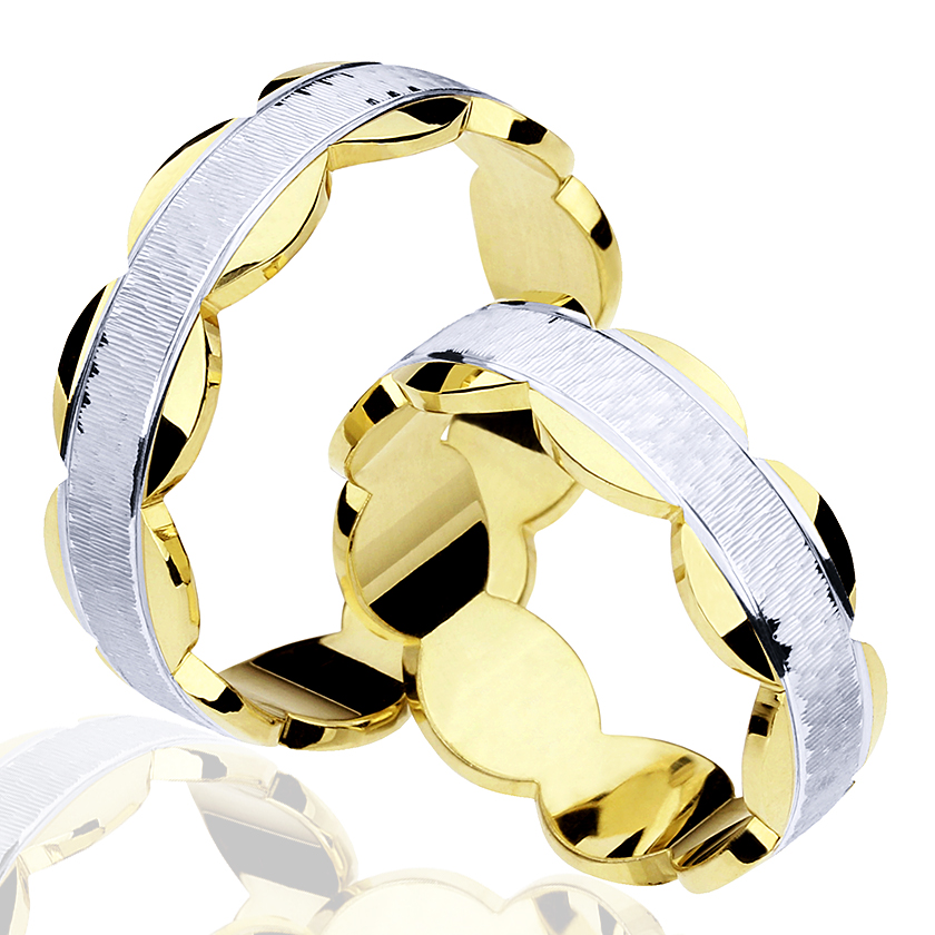 Par poročnih prstanov iz kombinacije rumenega in belega zlata. Prstana imata rahlo polkrožen profil. Vsak prstan sestavljajo med seboj dotikajoči se krogi z gladko površino, preko katerih poteka pas belega zlata z gladkim robom in graviranimi črtkami po notranjosti.