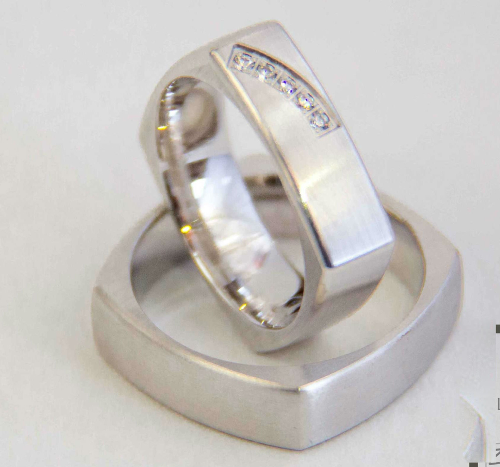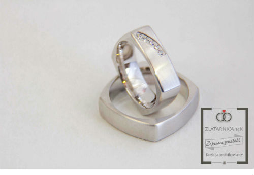 Par poročnih prstanov iz belega zlata. V ženski prstan je vdelanih 5 cirkonov. Število kamnov je možno poljubno spremeniti, prav tako je možno cirkone nadomestiti z briljanti. Prstana je možno izdelati tudi v drugi barvi zlata (rumeno, rdeče).