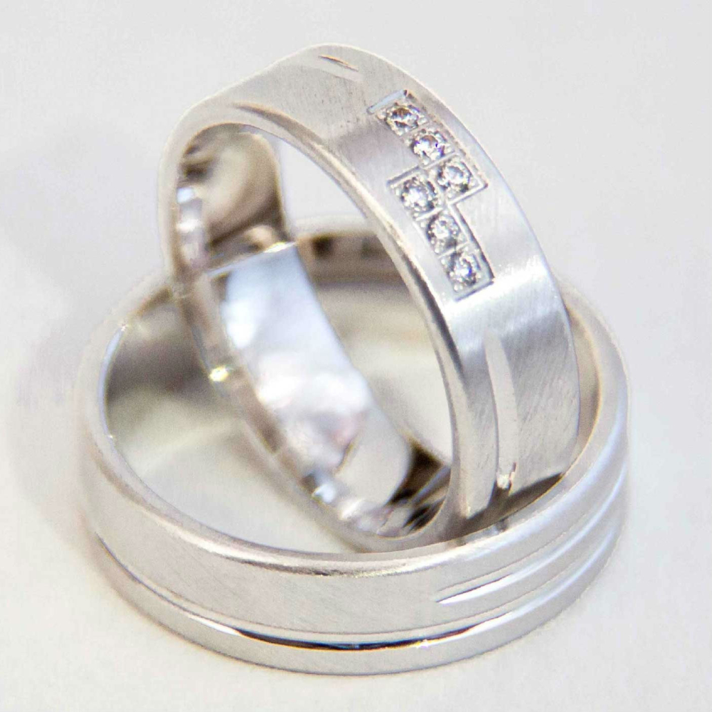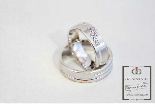 Par poročnih prstanov iz belega zlata. V ženskem je vkovanih 6 cirkonov, lahko vam vdelamo tudi briljante.