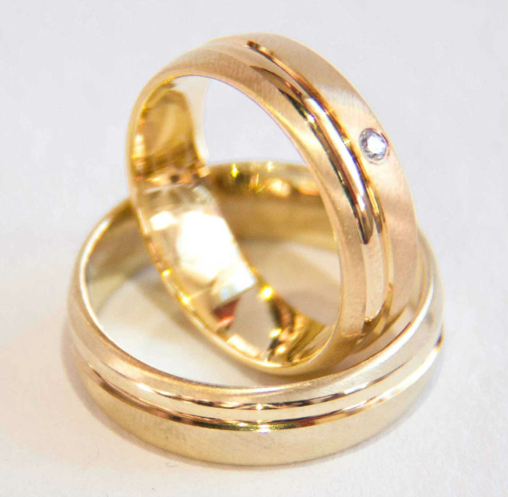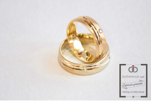 Par poročnih prstanov iz rumenega zlata. V ženski prstan je vkovan kamenček (cirkon ali briljant), število kamenčkov vam lahko poljubno spremenimo. Površina prstana je satinirana, čez prstan poteka gladka črta. Po želji lahko površino obdelamo tudi na kakšen drug način (gladka, peskana, matirana…).