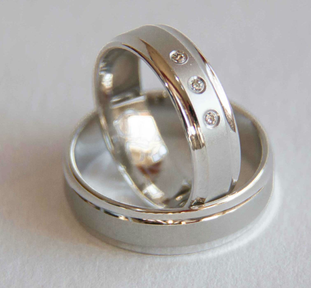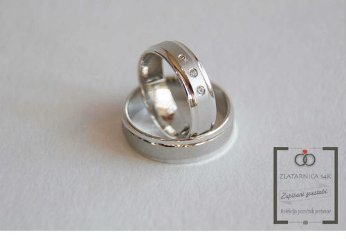 Par poročnih prstanov iz belega zlata. V ženski prstan so vkovani trije kamenčki (cirkoni ali briljanti), število kamenčkov vam lahko poljubno spremenimo. Površina prstana je matirana, robovi so gladki. Po želji vam lahko površino obdelamo tudi na kakšen drug način (gladka, peskana, satinirana, matirana…).