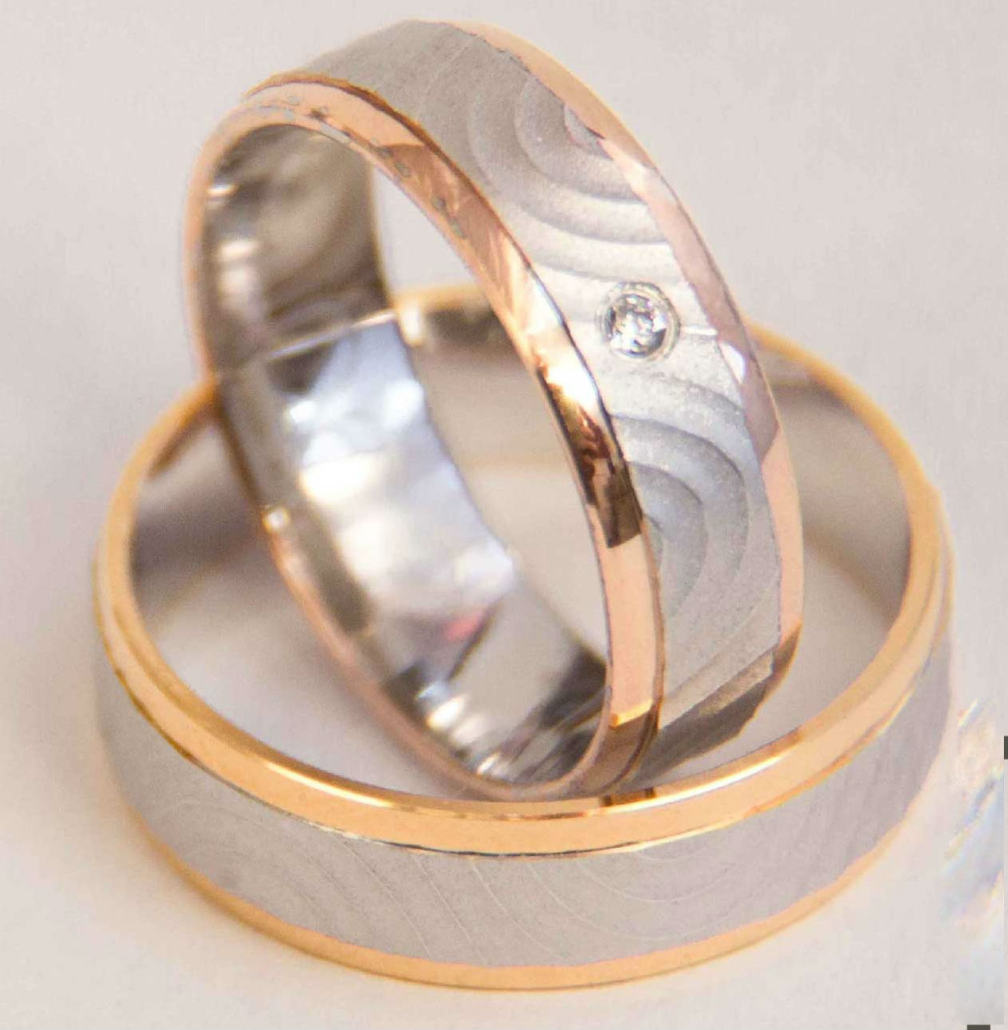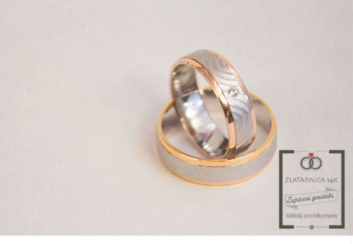 Par poročnih prstanov iz belega in rdečega zlata. V ženskem prstanu je vdelan kamenček (cirkon ali briljant).