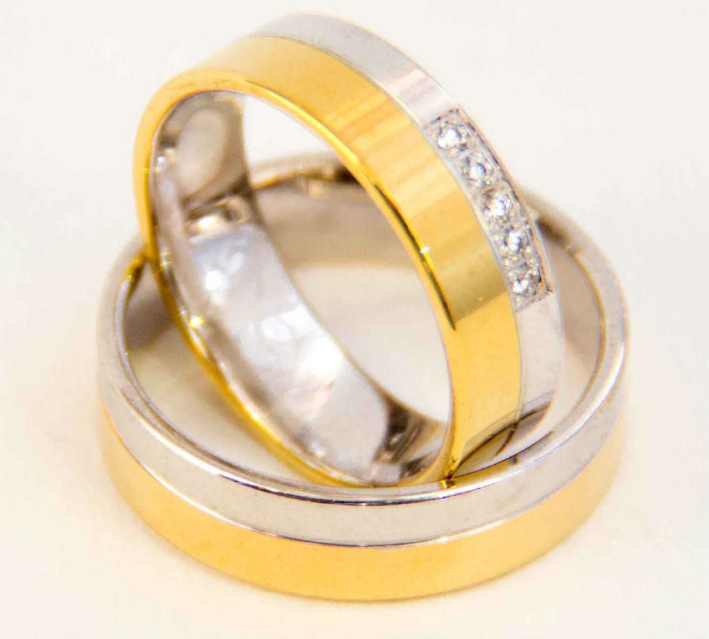 Par poročnih prstanov iz belega in rumenega zlata. V ženski prstan so vkovani štirje kamenčki (cirkoni ali briljanti), število kamenčkov vam lahko poljubno spremenimo.