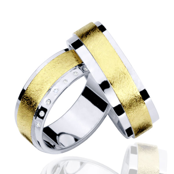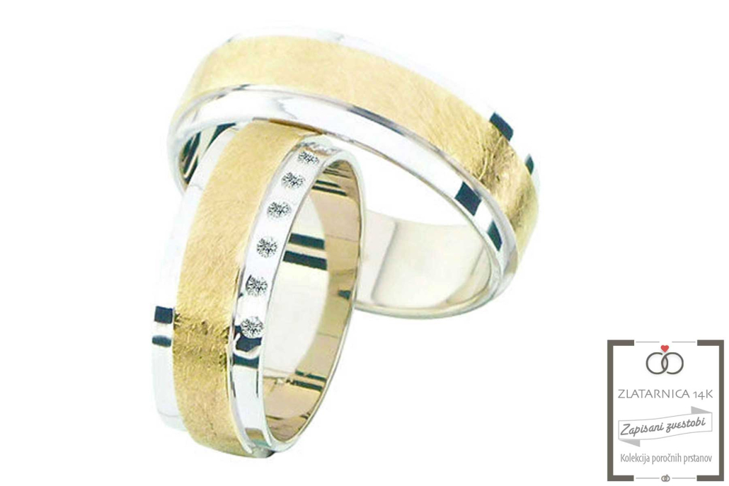 Par poročnih prstanov iz belega in rumenega zlata. Robovi prstanov so beli in imajo gladko površino, sredina je iz rumenega zlata in peskano površino. Ženskemu prstanu so dodani cirkoni.