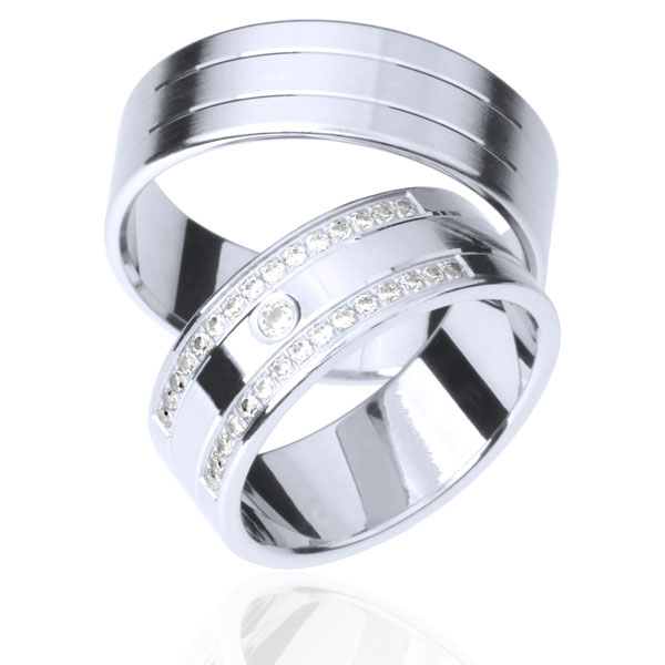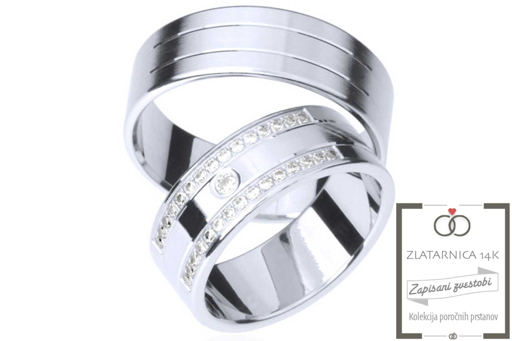 Par poročnih prstanov iz belega zlata. Površina prstanov je gladka, v ženski prstan so dodani cirkoni.