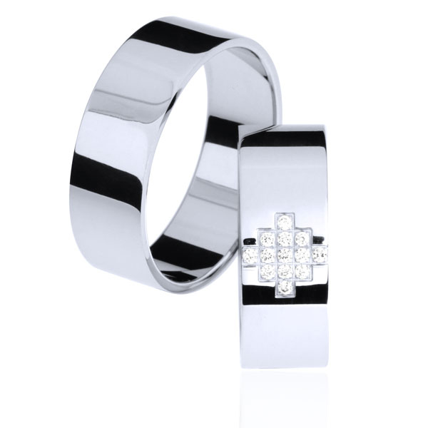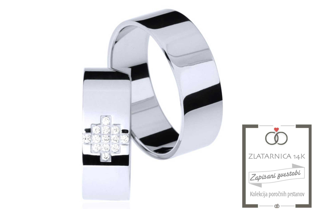 Par poročnih prstanov iz belega zlata. Površina prstanov je gladka, v ženski prstan so vkovani cirkoni.
