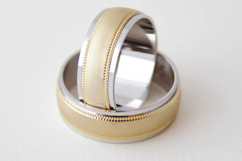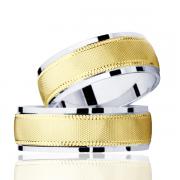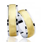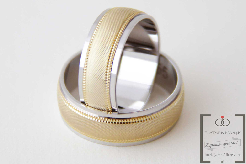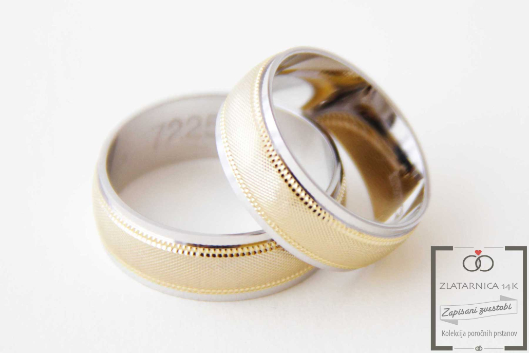Par poročnih prstanov iz kombinacije rumenega in belega zlata rahlo polkrožnegai profila. Površina prstanov iz rumenega zlata je diamantirana, robovi so iz belega zlata in gladki.