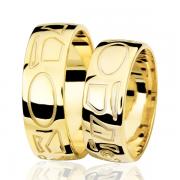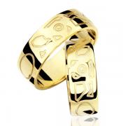 Par poročnih prstanov iz rumenega zlata. Prstana imata ovalni profil. Površina prstanov je gladka in obogatena z gravuro.