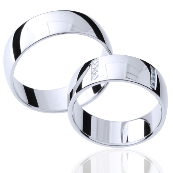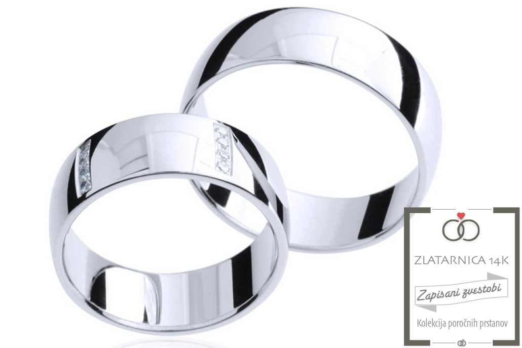 Par poročnih prstanov iz belega zlata. Ženskemu prstanu so dodani cirkoni v dveh ločenih vrstah.