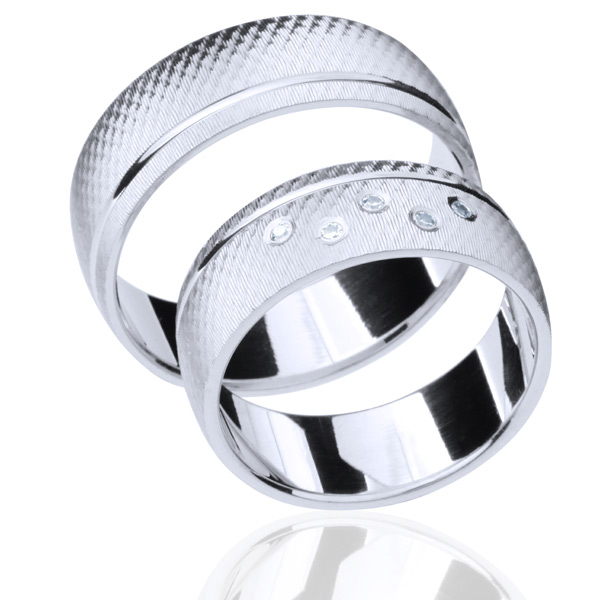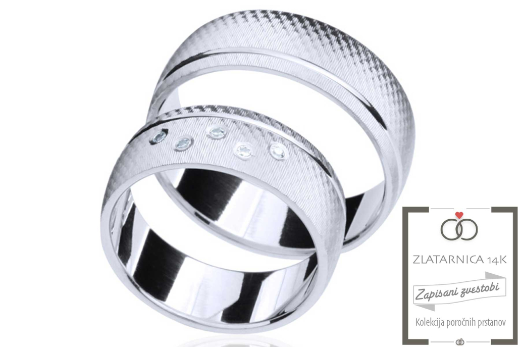 Par poročnih prstanov iz belega zlata. Ženskemu prstanu je dodanih 5 cirkonov.