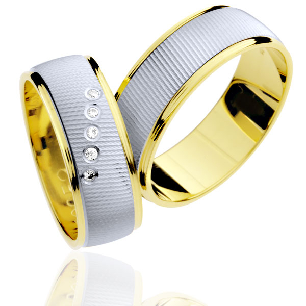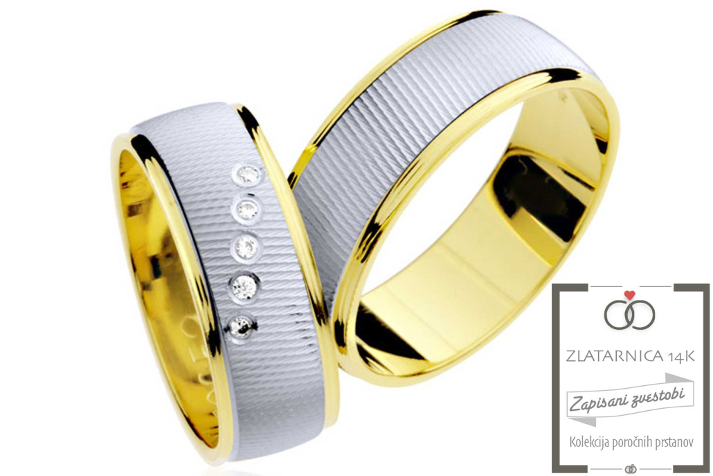 Par poročnih prstanov iz belega in rumenega zlata. Osnova prstanov je iz rumenega zlata, v sredi prstanov poteka ploskev iz belega zlata. Ženskemu prstanu je dodanih 5 cirkonov.
