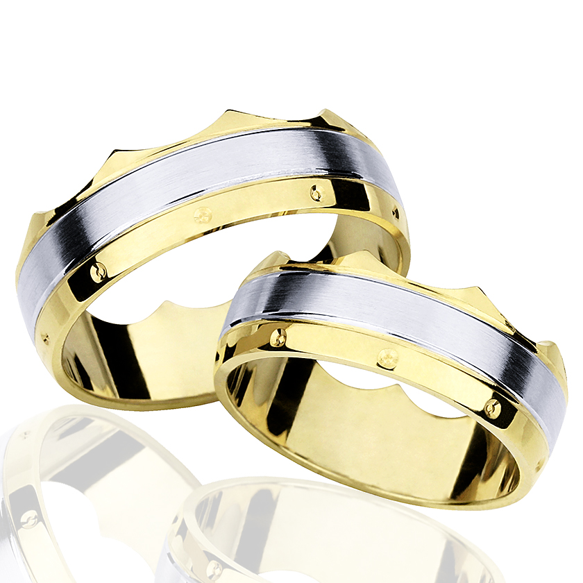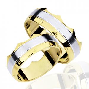 Par poročnih prstanov iz belega in rumenega zlata v obliki krone. Prstana imata rahlo polkrožni profil. Robovi iz rumenega zlata so polirani in obdelani z gravuro majhnih krogcev, ki daje izgled drobnih kamenčkov. Srednja linija je iz belega zlata z mat-ščetkano površino.
