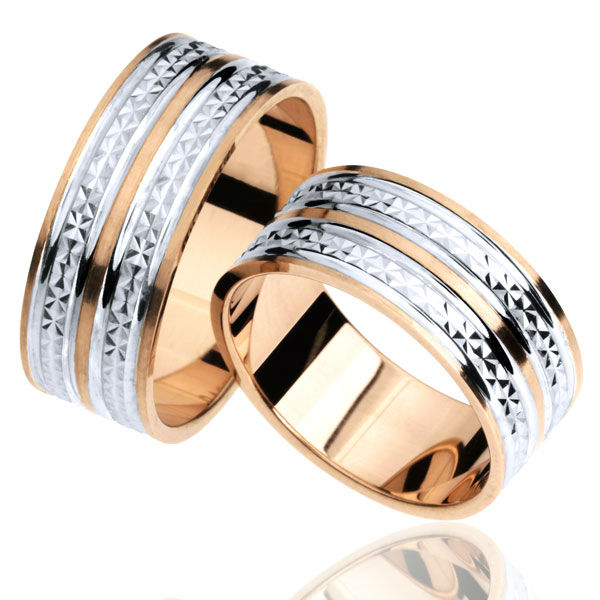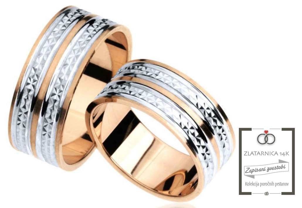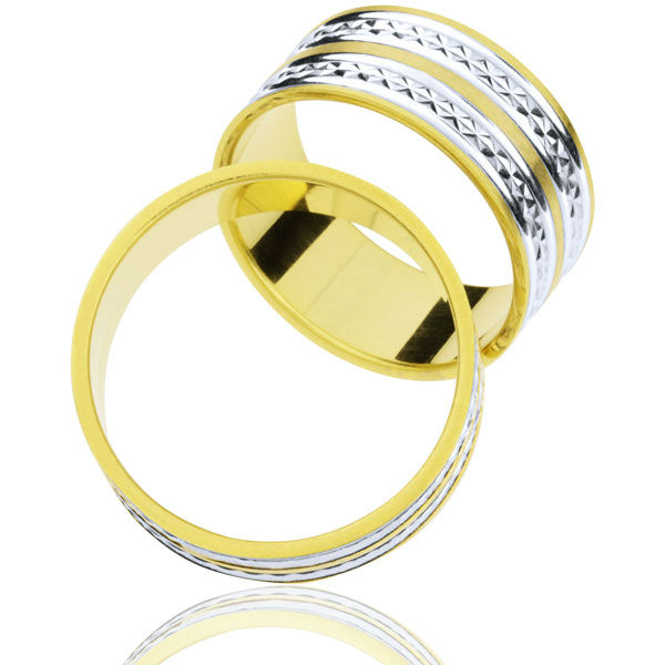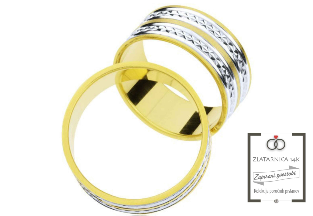 Par poročnih prstanov iz belega in rumenega zlata. Prstana imata ravni profil. Barve zlata se izmenjujejo po prstanu.