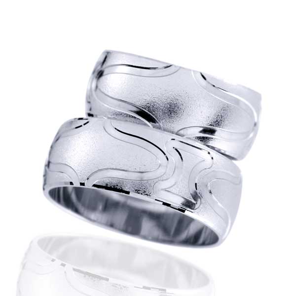 Par poročnih prstanov iz belega zlata. Po matirani površini potekajo tudi gladke črte.