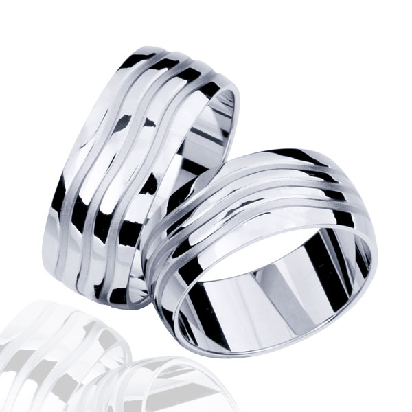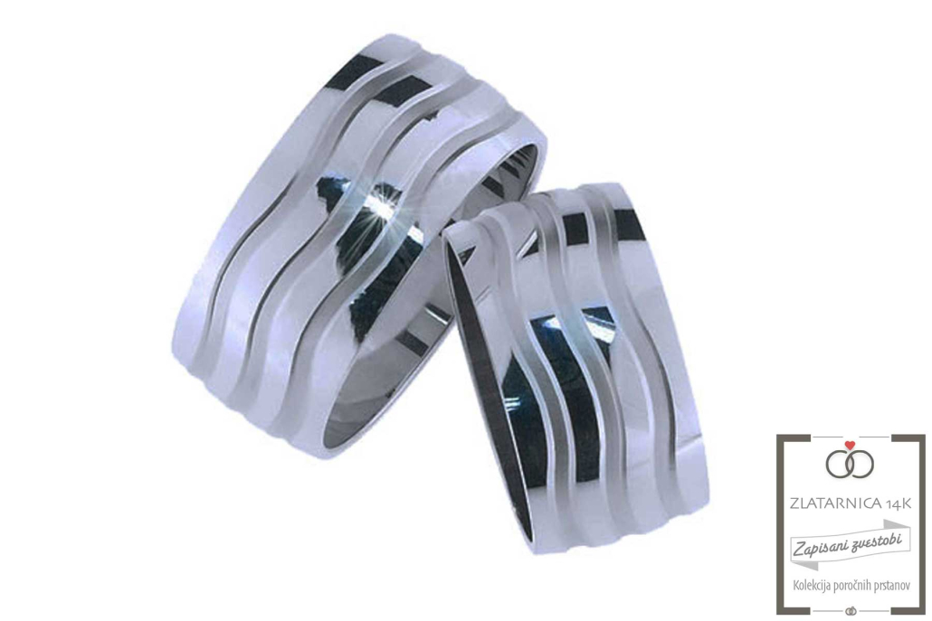 Par poročnih prstanov iz belega zlata. Po površini se izmenjujejo gladke in matirane črte v dveh nivojih.