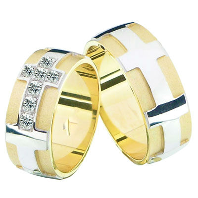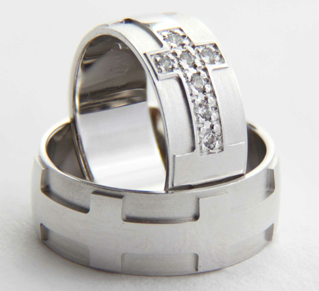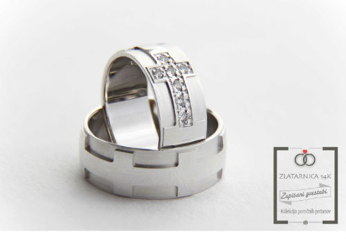 Par poročnih prstanov iz belega zlata. Del površine prstana je privzdignjen v obliki križev. V ženskei prstan so vkovani kamni.