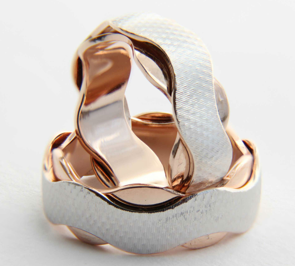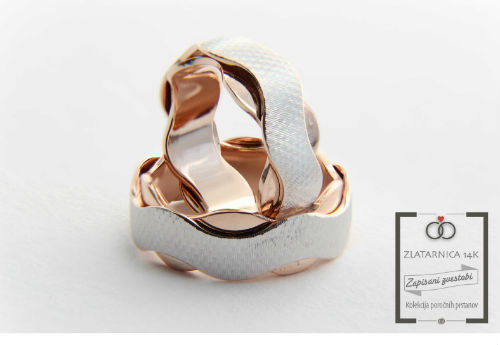 Par poročnih prstanov iz belega in rdečega zlata. Notranjost prstanov je ze rdečega zlata, preko katerega poteka ločen prstan iz belega zlata. Prstana se premikata in imata valovito obliko.