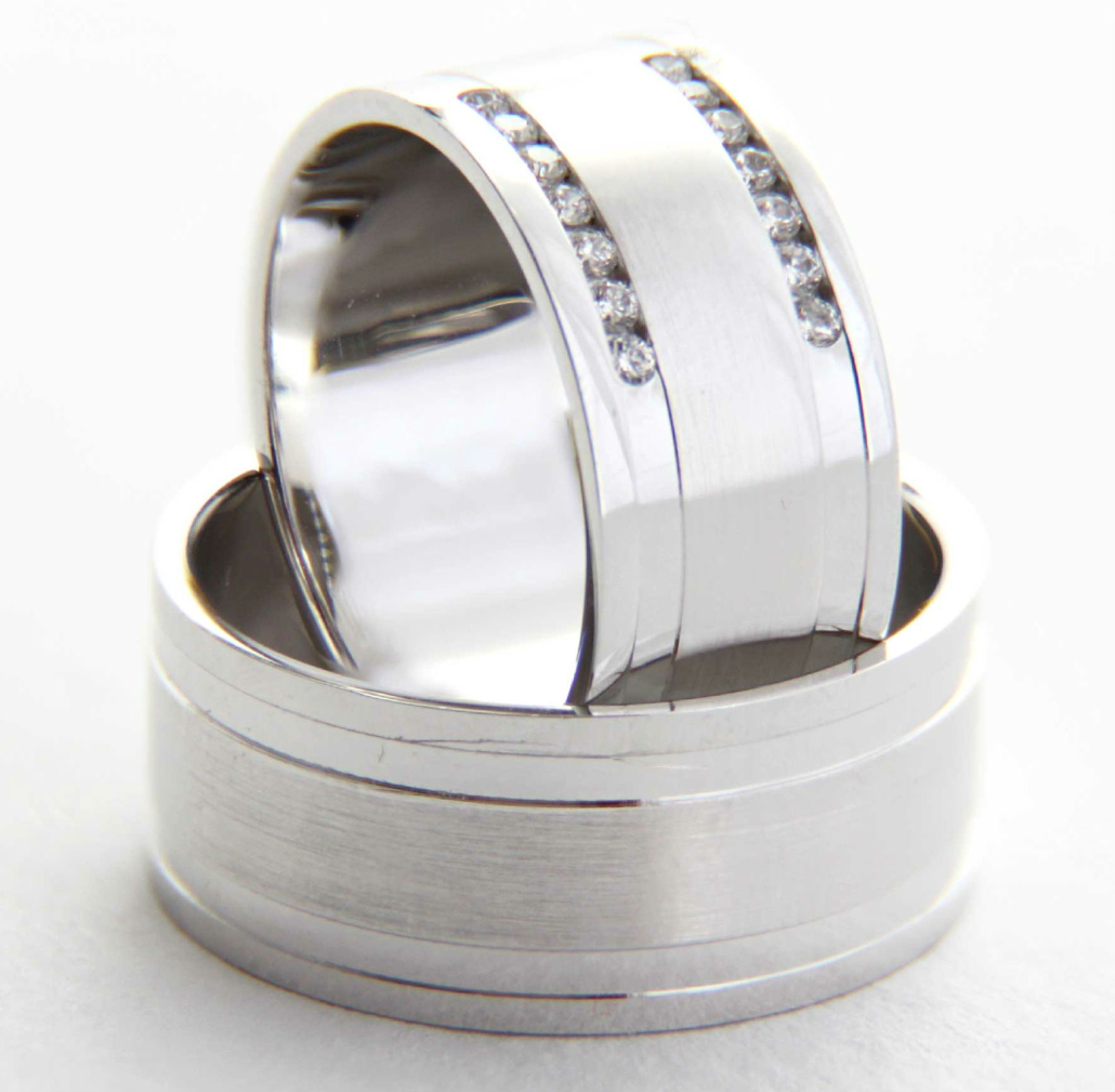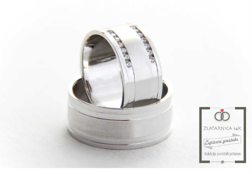 Par poročnih prstanov iz belega zlata. Prstana imata ravni profil, sredina prstana je matirana, robova gladka. Po robovih poteka 14 kamnov.