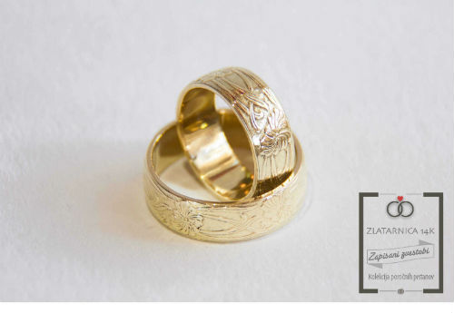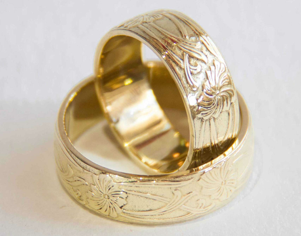 Par poročnih prstanov iz rumenega zlata. Na površini prstanov je motiv rož.