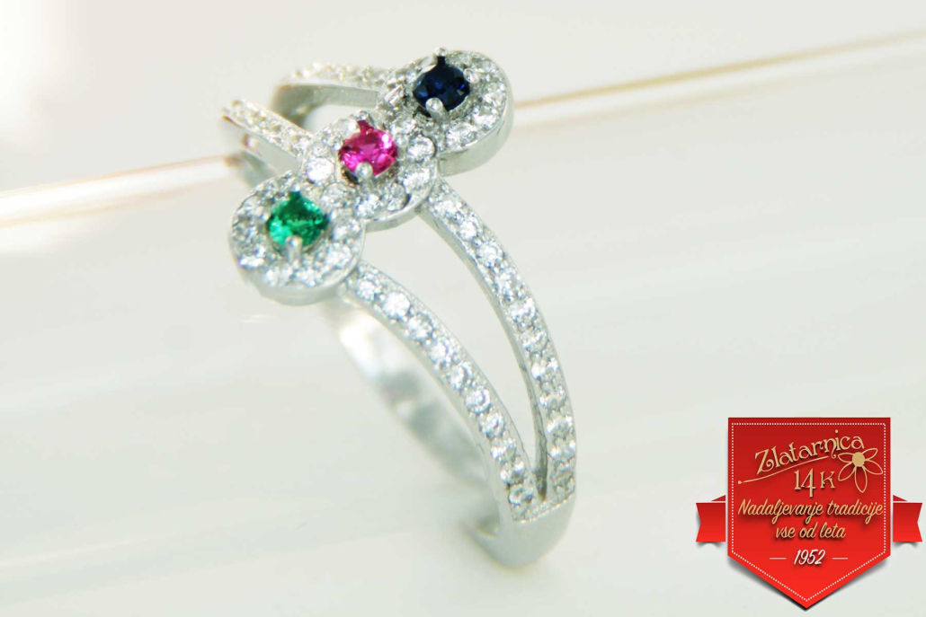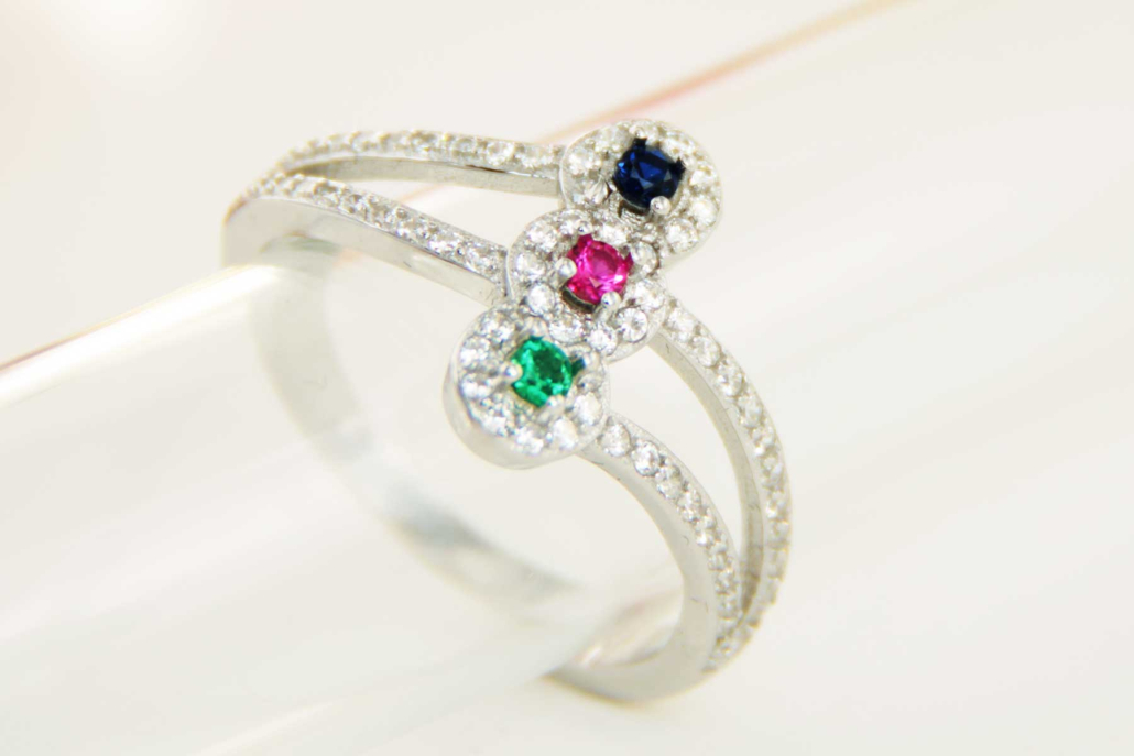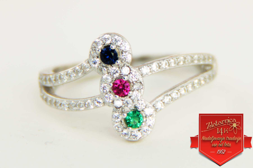 Prefinjen srebrni prstan s tremi barvnimi kamni: modri safir, rdeči rubin in zeleni smaragd, vkovanih v okroglih ploščicah med linijami, obdelanimi s cirkoni.
