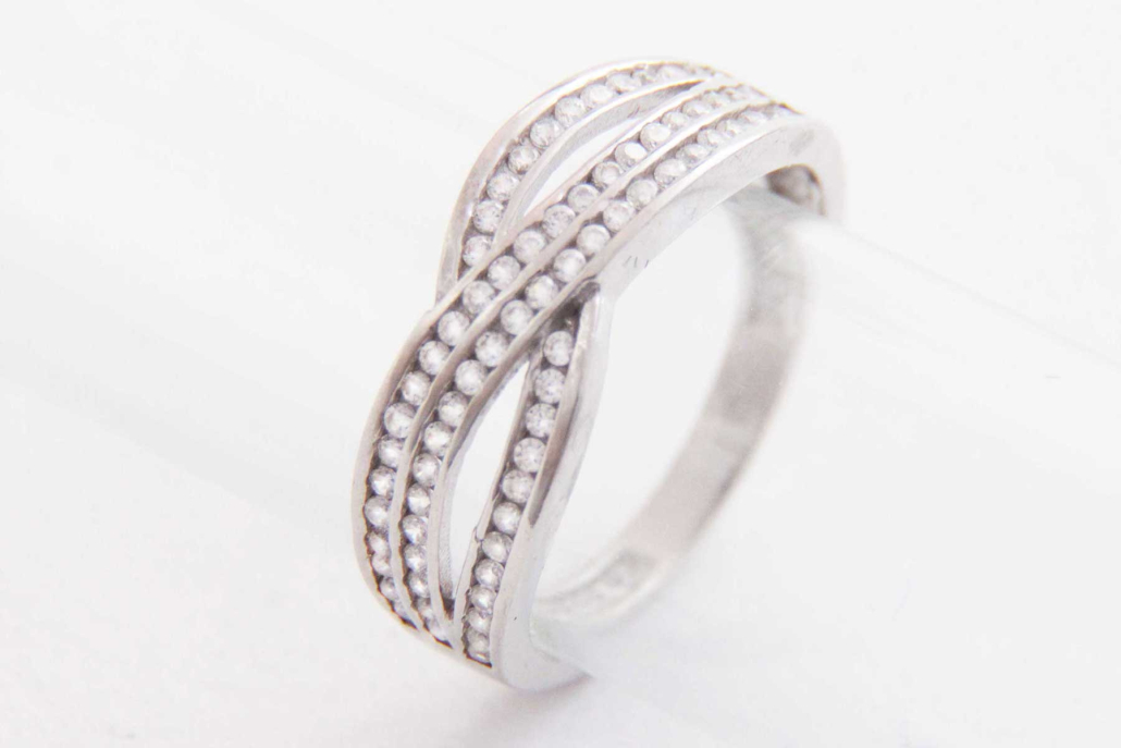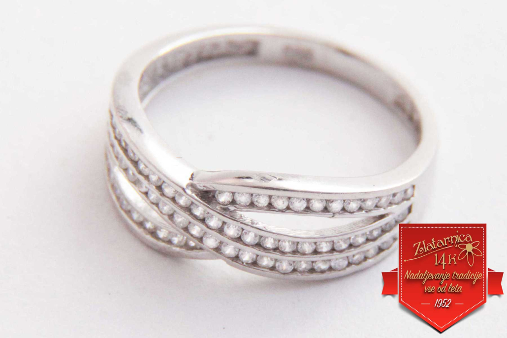 Srebrni prstan s cirkoni, razporejenimi v dveh linijah v sredini in dveh zavitih nasproti.