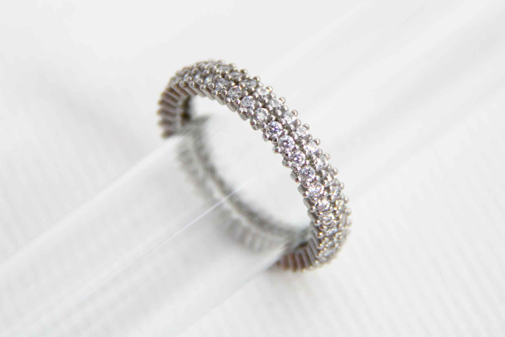 Elegantni srebrni prstan iz zaporedno vstavljenih cirkonov okrog in okrog.
